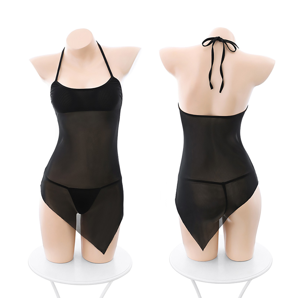 柔らかくボディに沿うストレッチメッシュは、着心地もなめらか。 透けるボディラインとアシンメトリーなスカーフヘムでスタイリッシュな印象に。 バスト部分は2重生地でやや透け感を抑えめに。 サイズ:レディース(M) セット内容:ベビードール、ショーツ @