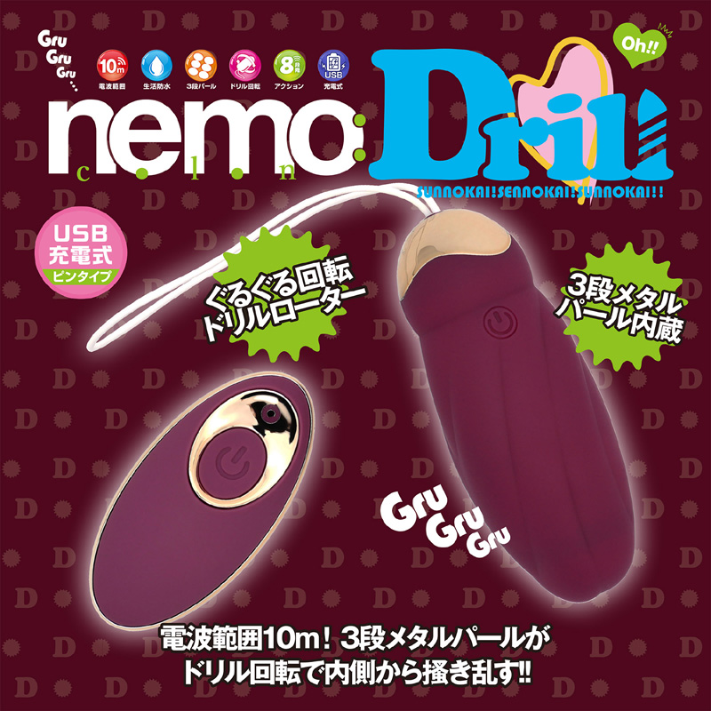 リトリスをやさしく削られるような未体験の刺激が気持ちいい。 ドリル内蔵・リモコンローター「nemo:ドリル」が登場です。 高速ドリル回転するローターヘッドを やわらかいソフトシリコンの外皮で包みました。 クリトリスを「こすりあげ」、チクビを「こすりあげ」、中から子宮口を「こすりあげ」。 「高速回転」と「激しい振動」が、アナタの「敏感な部分」を集中的に「こすりあげ」ます。 ・ドリル回転するのは複数配置された、ゴロゴロとした「大粒の3段パール」。 やさしいソフトシリコンの外皮の中で、アナタを激しく摩擦します。 ・ドリルパターンは理性を崩壊させる8種類。 やさしい刺激から激しい刺激、意外性でツボを攻める変則パターンまで、自由に選択してください。 ・10メートルの距離を埋めるリモコン操作。ワンボタンでさらに簡単。 ソーシャルディスタンスを守って「いちゃいちゃ」できるリモコンローターです。 ・ローター本体だけの単独利用でも、すべての機能が利用できます。 彼氏といっしょに使う時はリモコンで。ひとりで気持ちよくなりたいときは本体単独で楽しんでください。 ・生活防水対応 びしょびしょに汚しても問題なし。水洗いで簡単にキレイにできますよ。 ・お手軽なUSB充電方式を採用 コンパクトなサイズですが充電式です。充電には、付属のUSB充電ケーブルをご利用ください。 満充電で最大80分作動可能 ローターサイズ:8.7cm×3.5cm 重量:57グラム@
