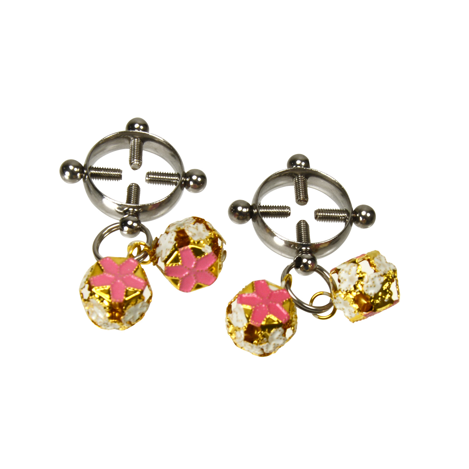 感じる乳首に、刺激的快感! リングに4つのリューズがついたネジ調整タイプ。 それぞれに2つのベルが取り付けてあり、 受け手の刺激に反応して鳴るベルの音が一層の興奮を盛り上げます! ビギナーからマニアまで。性別を問わずお使いいただけます。 @