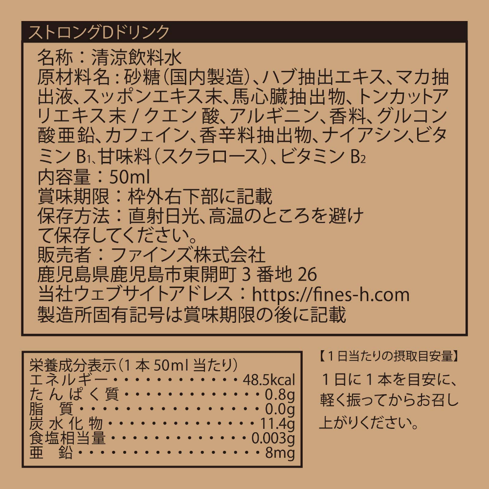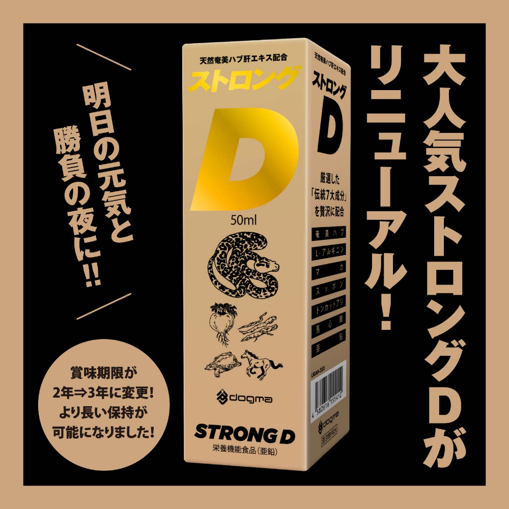大好評のドグマ「ストロングDドリンク」がリニューアル!飲みやすさ・味覚はそのままに、賞味期限が2年から3年に長持ちになりました!!サプリメントにも使用した希少な奄美ハブ成分を中心に、男の力の源「亜鉛」をプラスし、厳選した「伝統7成分」を贅沢に配合!明日の元気とがんばりたい夜におすすめ!「今夜は勝負!オスになれ!!ストロングD」検査番号:2402849@