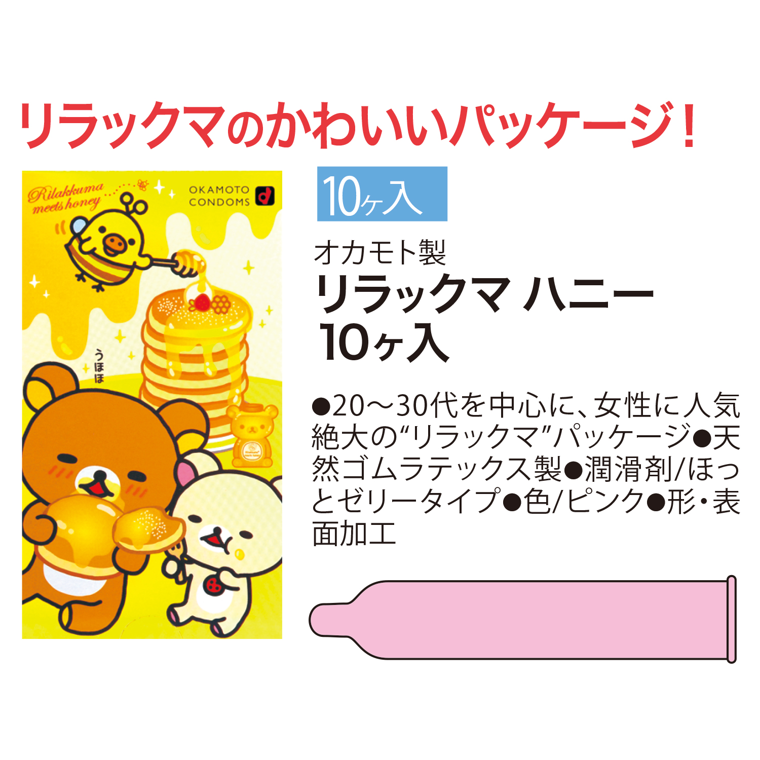 リラックマのかわいいパッケージ! ●20〜30代を中心に、女性に人気絶大の【リラックマ】パッケージ ●天然ゴムラテックス製 ●潤滑剤/ほっとゼリータイプ ●色/ピンク ●形・表面加工 10ヶ入