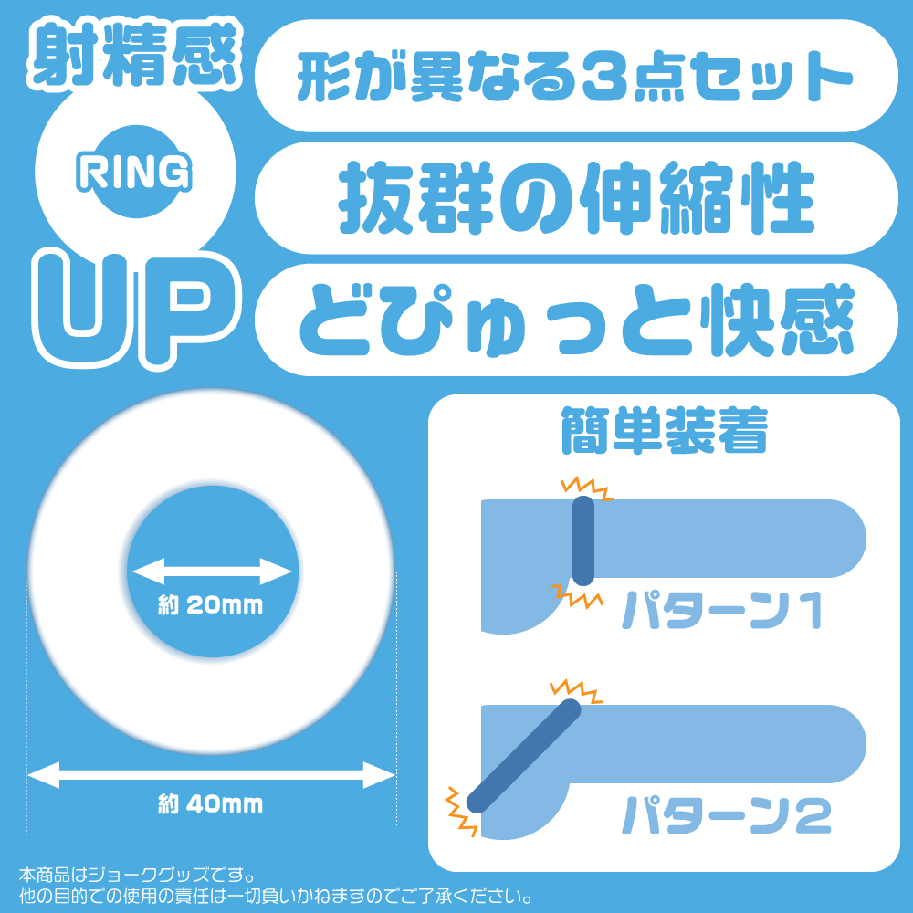 装着部位をググっと締め付け、膨張感と快感をアップさせるリング3種セットです。