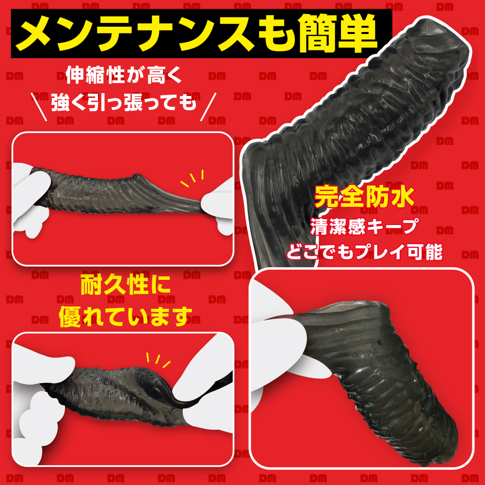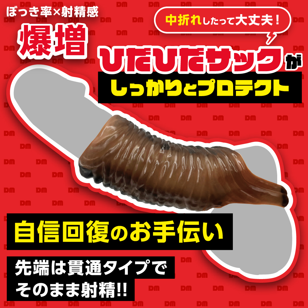 太く逞しい竿でパートナーの絶頂を、先端露出で自分自身の快感を。2人とも満足できる貫通型サック! 先端に穴が開いており、先っちょを露出することができるサックです。 装着する事で普段より太く逞しい竿を手に入れることができます。 先端を露出できる貫通型なので、装着者自身も快感を得られ、そのまま発射することも可能です。 「激ヒダ」は表面に有機的な横ヒダがびっしり搭載されており、ストロークのたびにパートナーの内壁を強力に擦り上げます。 引っ掛け紐が付いているのでプレイ中に外れる心配もありません。 パッケージサイズ(mm):H145×W73×D50 重量:57g 原産国:中国 材質:エラストマー
