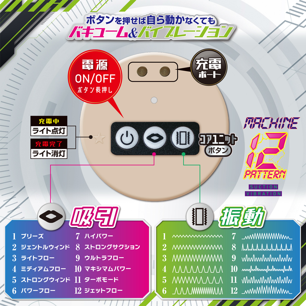 吸引&振動はそれぞれ12パターンあり、あなた好みがきっと見つかる大マンゾクマシマシ仕様。