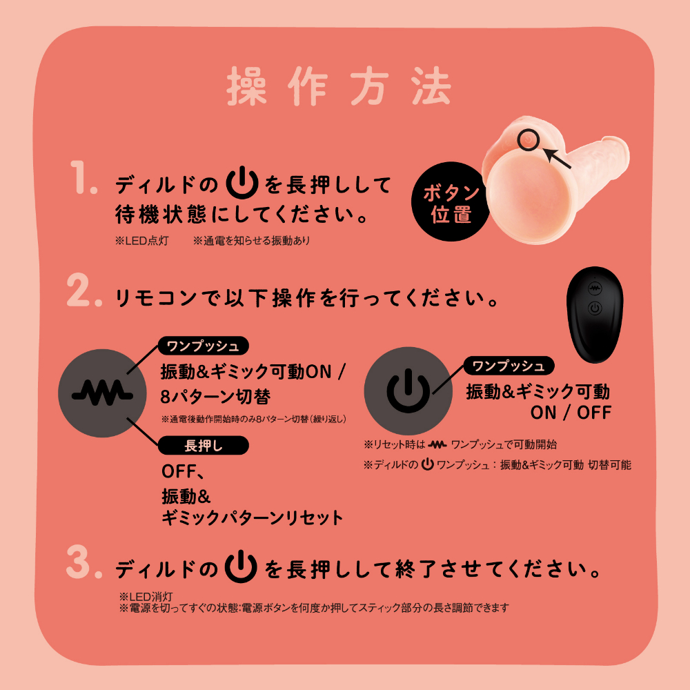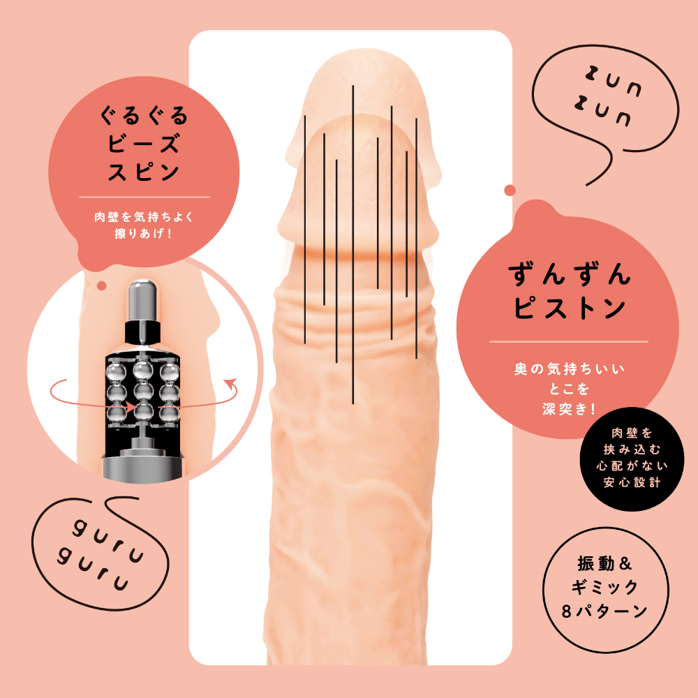 生棒感覚で超奥イキ!!突きながらかき乱す、ナマの絶頂快感が楽しめる電動ディルドです♪生々しい弾力と触り心地のぷにぷに肉棒!奥の気持ちいいとこを深突きするずんずんピストンギミックは肉壁を挟み込む心配がない安心設計。肉壁を気持ちよく擦りあげるぐるぐるビーズスピンギミックで敏感ゾーンを極み責め!吸盤でしっかり固定が可能なので普段味わえない向きからの責められ感も堪能できます!肌ざわりなめらかな高品質ソフトシリコン仕様です。本体は充電式なのでエコに使用可能。自分好みの刺激をリモコン操作で簡単に堪能できます。※本体:充電時間約150分※本体:最大連続稼働時間約100分(初期振動パターン未変更時)_IPX6等級_ピストン&ビーズスピン:8パターン振動_付属品:電池式リモコン、USBフォーンプラグ式充電ケーブル※IPX6:放水ノズルを使って噴流水を最低3分間あてる試験(浸水は不可となります)検査番号:2402564