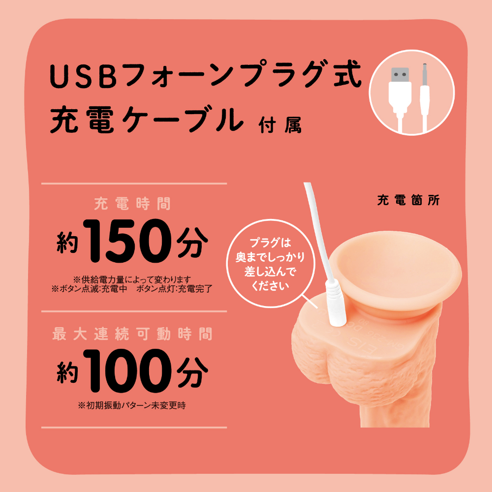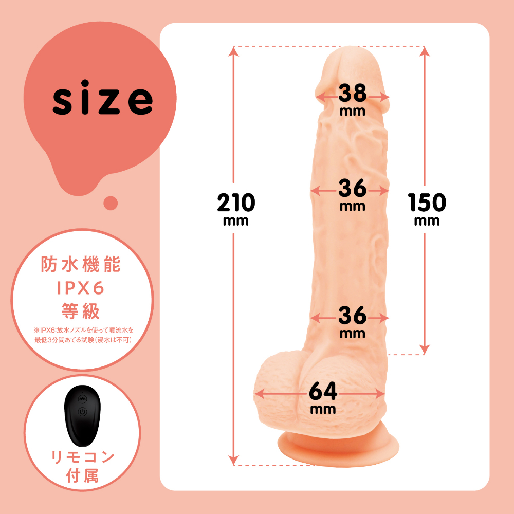 ■商品サイズ(mm) 縦280横150奥行80 ■商品重量(g) 505 ■本体サイズ(mm) 本体:210×63×85mm リモコン:60×35×15mm ■本体重量(g)、内容量(ml) 435(本体:367g フォーンプラグ式USB充電ケーブル(白):10g リモコン:13g ブリスター:45g ) ■付属品 5ml パウチローション、USB充電ケーブル、リモコン - 生棒感覚で超奥イキ!!突きながらかき乱す、ナマの絶頂快感が楽しめる電動ディルドです♪生々しい弾力と触り心地のぷにぷに肉棒!奥の気持ちいいとこを深突きするずんずんピストンギミックは肉壁を挟み込む心配がない安心設計。肉壁を気持ちよく擦りあげるぐるぐるビーズスピンギミックで敏感ゾーンを極み責め!吸盤でしっかり固定が可能なので普段味わえない向きからの責められ感も堪能できます!肌ざわりなめらかな高品質ソフトシリコン仕様です。本体は充電式なのでエコに使用可能。自分好みの刺激をリモコン操作で簡単に堪能できます。※本体:充電時間約150分※本体:最大連続稼働時間約100分(初期振動パターン未変更時)_IPX6等級_ピストン&ビーズスピン:8パターン振動_付属品:電池式リモコン、USBフォーンプラグ式充電ケーブル※IPX6:放水ノズルを使って噴流水を最低3分間あてる試験(浸水は不可となります)検査番号:2402564