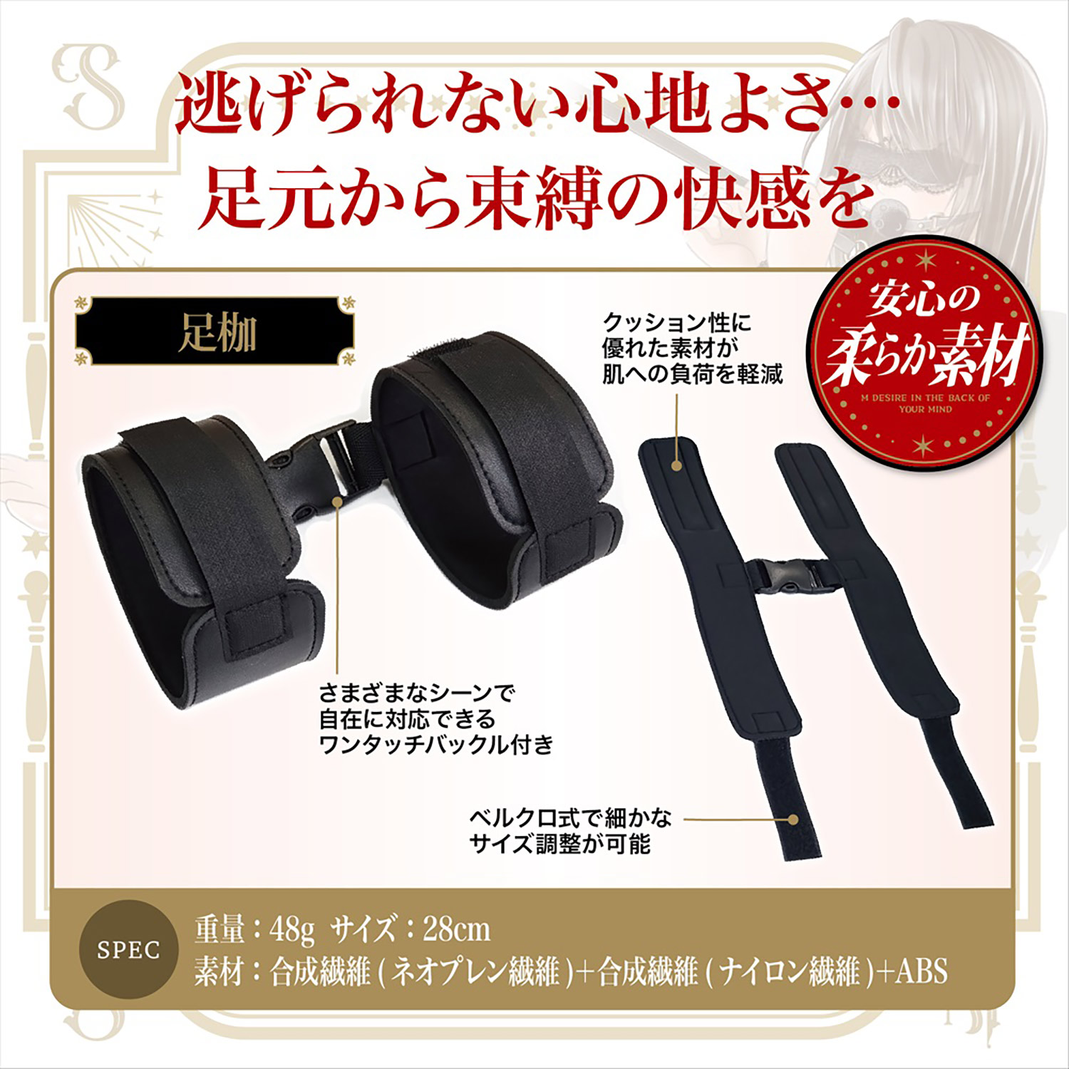 手だけでは物足りない、足枷も繋げば拘束感がUP!簡単装着、柔らか素材で逃げられない心地よさ足元から束縛の快感を!
