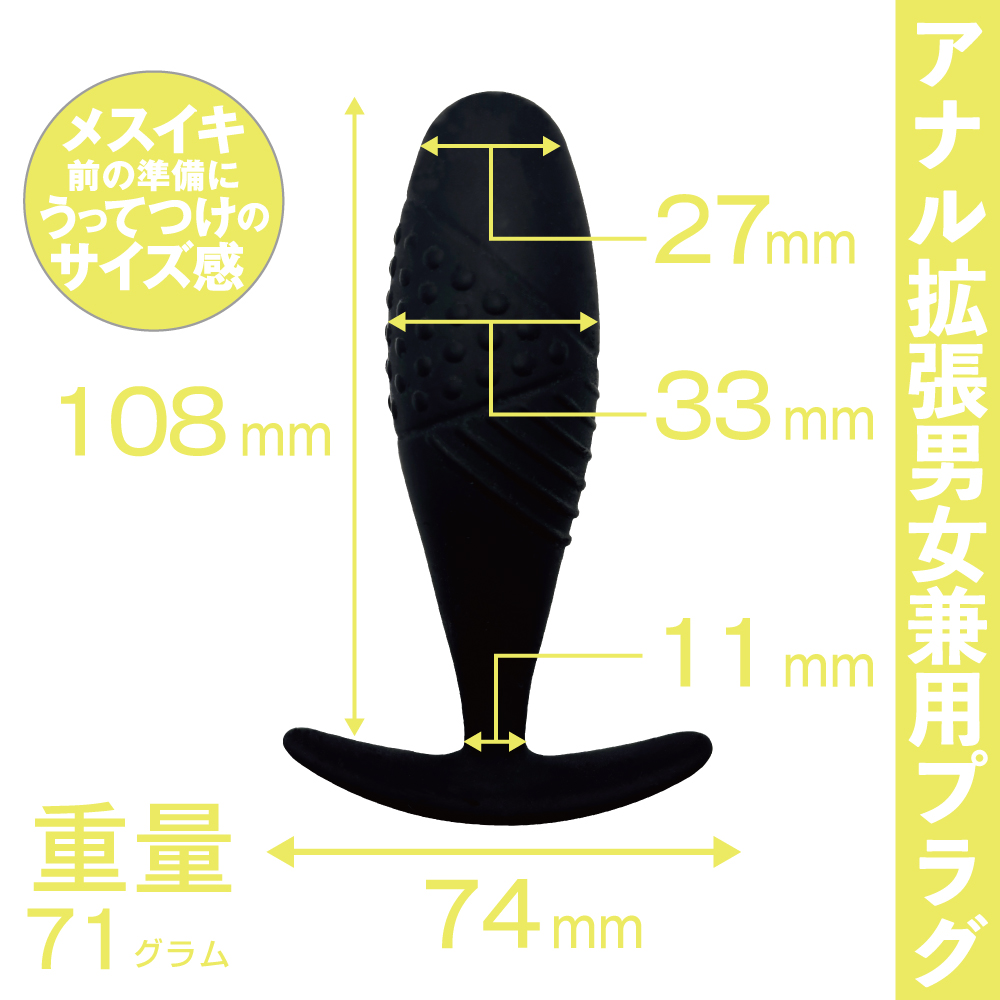 メスイキ前の準備にうってつけのサイズ感。 男女兼用アナル拡張用プラグ。拡張することでアナルプレイの幅が広がる。 中級者向けの中型サイズ。アナルを広げてプレイの幅を広げる、アナル拡張用プラグ。 最大幅33mmと、少し拡張の進んだ方におすすめしやすい中型サイズです。 長期間挿入して生活することで、徐々に拡張できます。 硬すぎないソフトシリコン製で、緩やかなカーブを描いており、スムーズに挿入できて安心。 洗浄も簡単なので清潔に使用できます。 パッケージサイズ(mm):125×79×45 重量:71g 原産国:中国