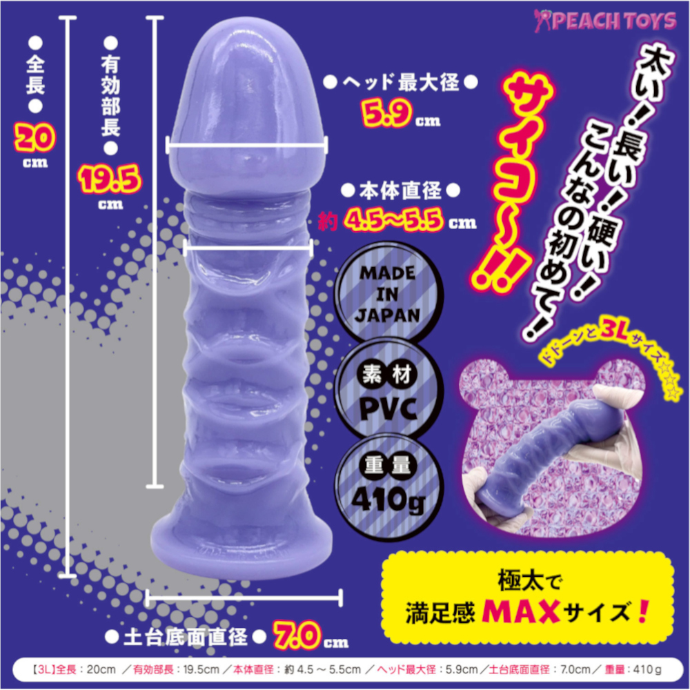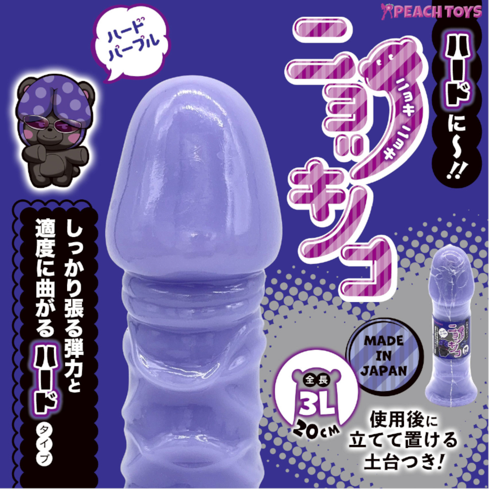 ハードに~!!ニョキニョキニョッキノコ!! 「ニョッキノコ(ハードパープル)」ディルドの登場です! 柔らかくて弾力感たっぷりの「ニョッキノコ(ソフトピンク)」が、ガツンとハードなパープルディルドに大変身!! ●硬すぎない素材で張り感MAXのハード素材がいい感じ!! ●しっかり張る弾力と適度に曲がるハードタイプ!! ●使用後に立てて置ける土台つき! 【3Lサイズ】 ・ドドーンと3Lサイズ☆☆☆ ・極太で満足感MAXサイズ! ・太い!長い!硬い!こんなの初めて!サイコー!! 全長200mm 有効部長:195mm 本体直径:約45~55mm ヘッド最大径:59mm 土台底面直径70mm パッケージサイズ(mm):H200×W70×D70 本体サイズ(mm):200×70×70 重量:本体410g/総重量415g 原産国:日本 材質:PVC