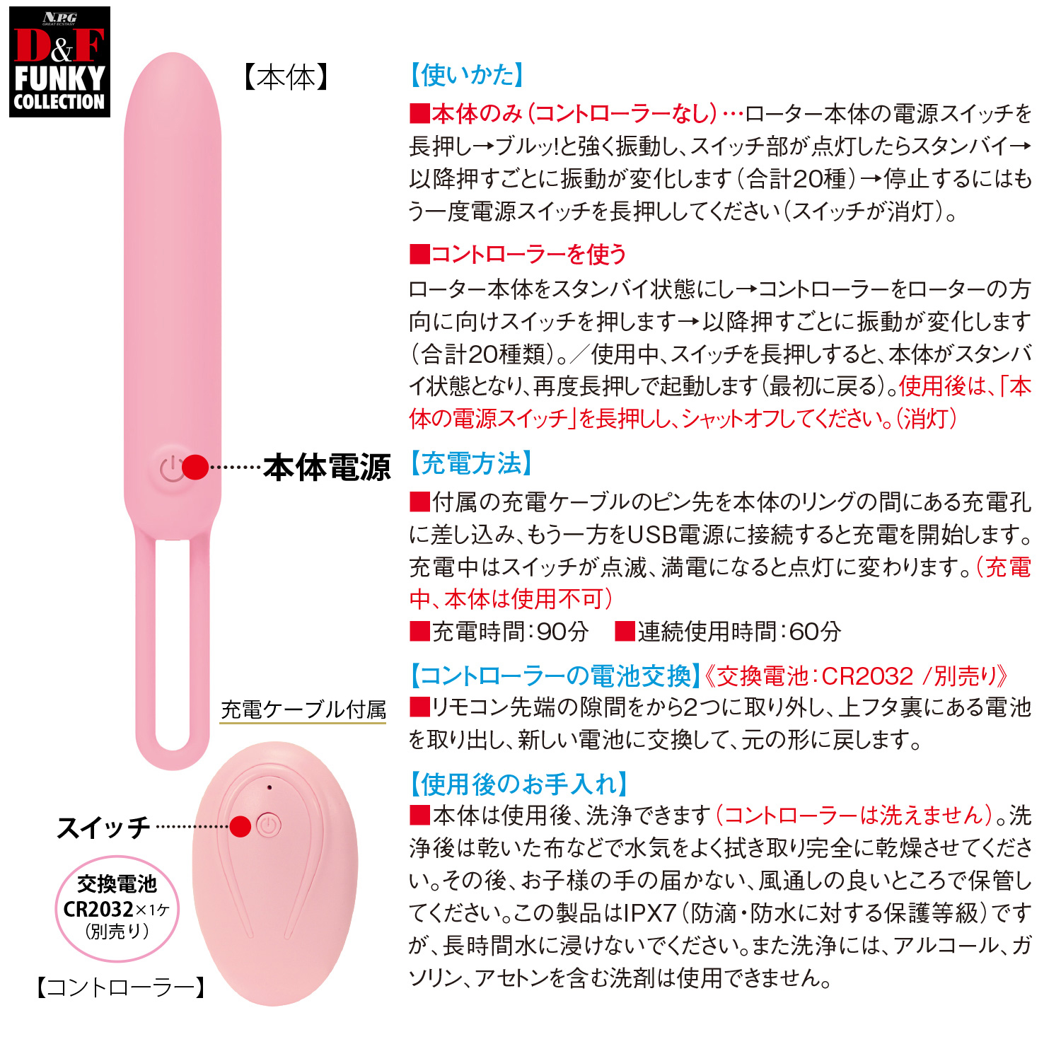 本体のボディは防水等級IPX7。使用後は洗浄可能です。(コントローラーは洗えません)