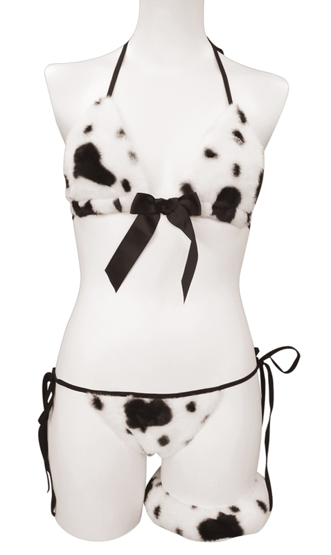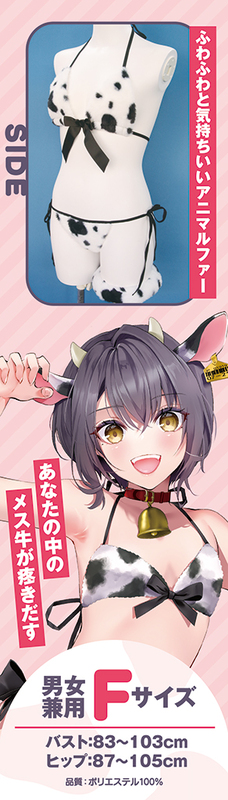 男女兼用 大胆でセクシーな牛柄コスチュームで、野生の魅力を解き放て! あなたの中のメス牛が疼きだす キュートなガターリング付 露出度高めのビキニセット ふわふわと気持ちいいアニマルファー 柔らかくて着心地がGOOD! バスト 83~103cm ヒップ 87~105cm Fサイズ ポリエステル100% イラスト:あかつき聖