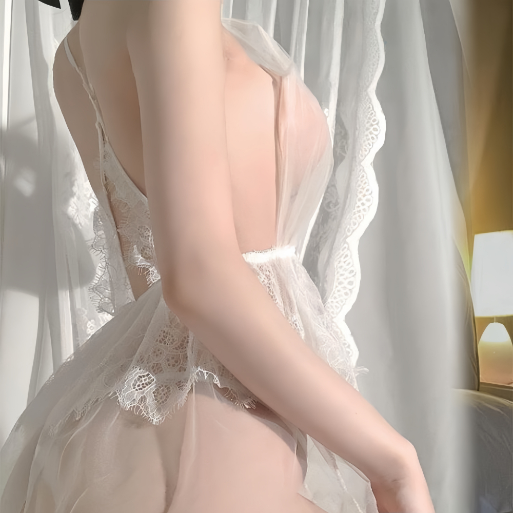 ★ホワイトレースが気品をかもし出す天使のシースルーデザイン!★胸元のパールアクセントでバストの谷間をカゲキ&可憐に見せまくり!★カラダを優しく包み込むレースドレスと極小Tバックで求愛モードに!これはもう夜のウェディングドレス!?純白レースとパールアクセが誘惑ポイントのオトナ清楚系ドレスランジェリー!まるで花嫁のような純真無垢な雰囲気をカラダにまといつつ、心に秘めた情熱も大好きな人に丸ごと伝えちゃう官能デザインです!さらに、シースルーの柔らかなレースが体を優しく包み込んで、肌の透明感を滑らかに演出します。特別な時間をよりムード満点に彩る最高の一着。清純さと大人の魅力のダブル攻めで彼のハートをガッチリつかみたいなら、これで決まり!