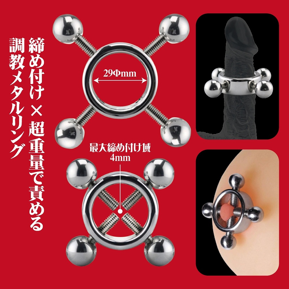 【内容:1個】 剛撃に悶え狂え! 鬼の如き力で締め付け×超重量で責める金属製、調教メタルリング! 4方向から乳首をしっかりと挟み込みリングを固定。 乳首攻めによる刺激はやがて快感へと変貌してゆく…。 商品詳細