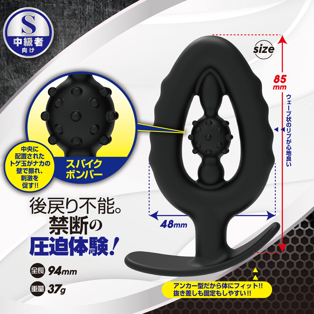 潰して入れて、支配する。 反発を利用した弾ける圧迫感が愉しめる、新感覚の中空型プラグ『アナバウンサー』 本体を指で潰し、その状態で穴に差し込むと中で反発し、未体験の圧迫感を誘発。 出し入れして刺激を味わうもよし、トレーニングするもよし。 一度入れれば、後戻り不能。禁断の圧迫体験を愉しもう! 【ボディ特徴】 ・本体が中空型なので、ナカで反発 ・ウェーブ状のリブが心地良さを演出 ・ボディ中央のトゲトゲが、壁で擦れて刺激を促す ・底部はアンカー型で、抜き差しや固定もし易く、体にもフィット 【Sサイズ】中級者~上級者におススメ パッケージサイズ(mm):H158×W95×D32 本体サイズ(mm):全長94/横幅61 重量:本体37g/総重量58g 原産国:中国 材質:シリコン