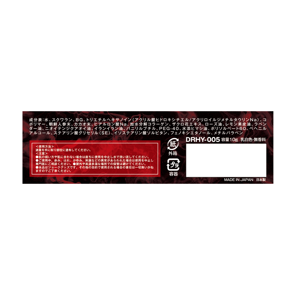 人気AVメーカー「Goonies」コラボ!媚薬シリーズの撮影で使用されている特注クリームを市販化!敏感!ぽわんと温感!?いつもとなんだか違う!?イランイラン油、カカオ末、朝鮮人参末、ザクロ花エキスの古来から伝わる植物由来4大配合!AV現場での実地テストと製造元にて研究を重ねた至高のプロ仕様クリーム!! ■商品サイズ(mm) 縦132横32奥行32 ■商品重量(g) 25 ■本体サイズ(mm) 縦71横22奥行15 ■本体重量(g)、内容量(ml) 10