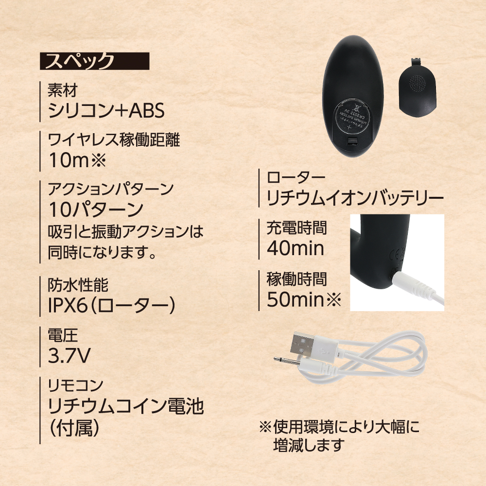 秒で潮吹き!?チュパチュパ吸引刺激と驚きのビチビチ振動アクションで中も外も同時責め!丁寧なチュパチュパ真空吸引機構で外をじっくり責めながら、程良い弾力性があり肌触りの良い高品質シリコン素材の中責め部分がまるで生きているようなビチビチ振動アクションでGス○ットをビクビク刺激!思わず吹いちゃう強力コンビネーションバイブレーター。振動パターンは実用性の高い10パターンをプログラム。ワイヤレス稼働距離は10M以上(※1)40分の充電で最大50分の連続使用が可能です。(※1)IPX6の高レベル防水なので使用後はしっかり洗って長く衛生的にご使用いただけます。(※1使用環境により大幅に増減します)