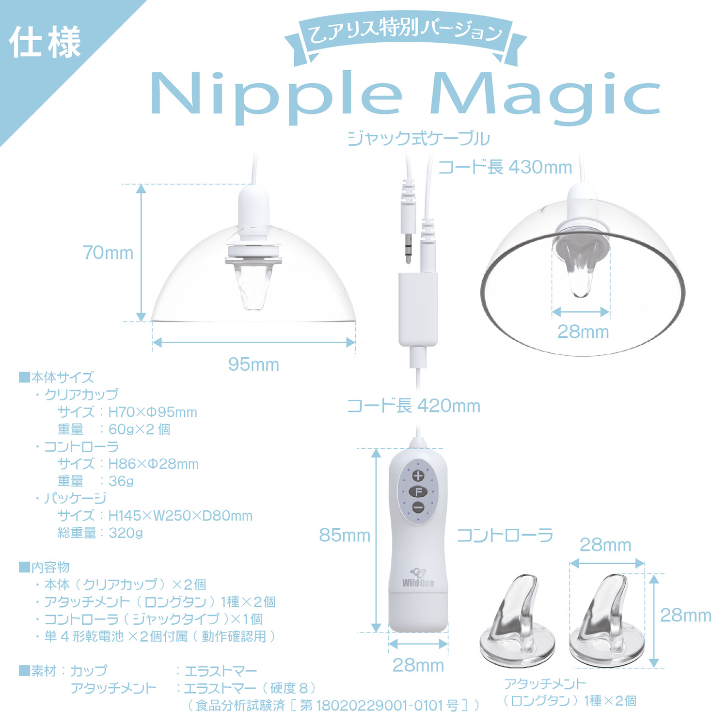 ビギナー向け乳首開発グッズ「ニップルマジック」に、【乙アリス】の極厚ロング舌をイメージした特製アタッチメントをセット! やわらか透明カップが生み出すライブ感に、覚醒待ったなし! お求めやすい価格で乳首開発ブームを支える「ニップルマジック」に、人気AV女優【乙アリス】パッケージが登場! 今回は、彼女のとろけるような肉厚舌をイメージした特製アタッチメント「ロングタン」を同梱。 「ニップルドリームライド」限定だった同名の長舌アタッチメント(硬度25)を、限界までやわらかく(硬度8)しました。 別売の「【ニップルアタッチメント】(別売)」と交換も、マグネット式でラクラク自在です。 ライブ感たっぷりの透明カップが、快感を劇的にアップ。 あたりポイントを絞りやすいので、ビギナーにも大好評です。 この透明感を保ったまま、乳房にやさしくフィットできるソフト素材を実現しているのは、この「ニップルマジック」だけ! 「野外プレイがしたい」を満たすため、服で隠せてブラ固定もラクラクなカップ型。 すぐに使える乾電池式コントローラは、10種類の回転と12段階のパワーを操作可能。 合計120パターンの快感が、あなたの乳首を覚醒させます。 〈かんたん〉〈お気軽〉〈お手頃〉をコンセプトに、リーズナブルに楽しめる「ニップルマジック」は、未知なる快感への第一歩です! ※「ニップルカップR」「ニップルドームR」とは、回転パターンや、同梱品が異なります。 ※アタッチメントを取り外す際に磁石が強いときは、ムリに上に引っ張らず、横にスライドして外してください。 ●クリアカップ サイズ:H70×φ95mm 重量:60g×2個 素材:高級エラストマー ●コントローラ サイズ:H86×φ28mm 重量:34g×1個 ●アタッチメント(ロングタン) サイズ:H28×φ28mm 重量:8g×2個 素材:高級エラストマー(硬度8) 食品分析試験済[第18020229001-0101号] ●内容物 本体(クリアカップ)×2点、アタッチメント(ロングタン)1種×2点、コントローラ(ジャックタイプ)、単4形乾電池×2本(動作確認用) ※付属の乾電池は動作確認用ですので、別途、単4形アルカリ乾電池×2本をご用意ください。 ※標準ブラシアタッチメントの同梱はありません。 ●パッケージ サイズ:H145×W250×D80mm ●総重量:320g