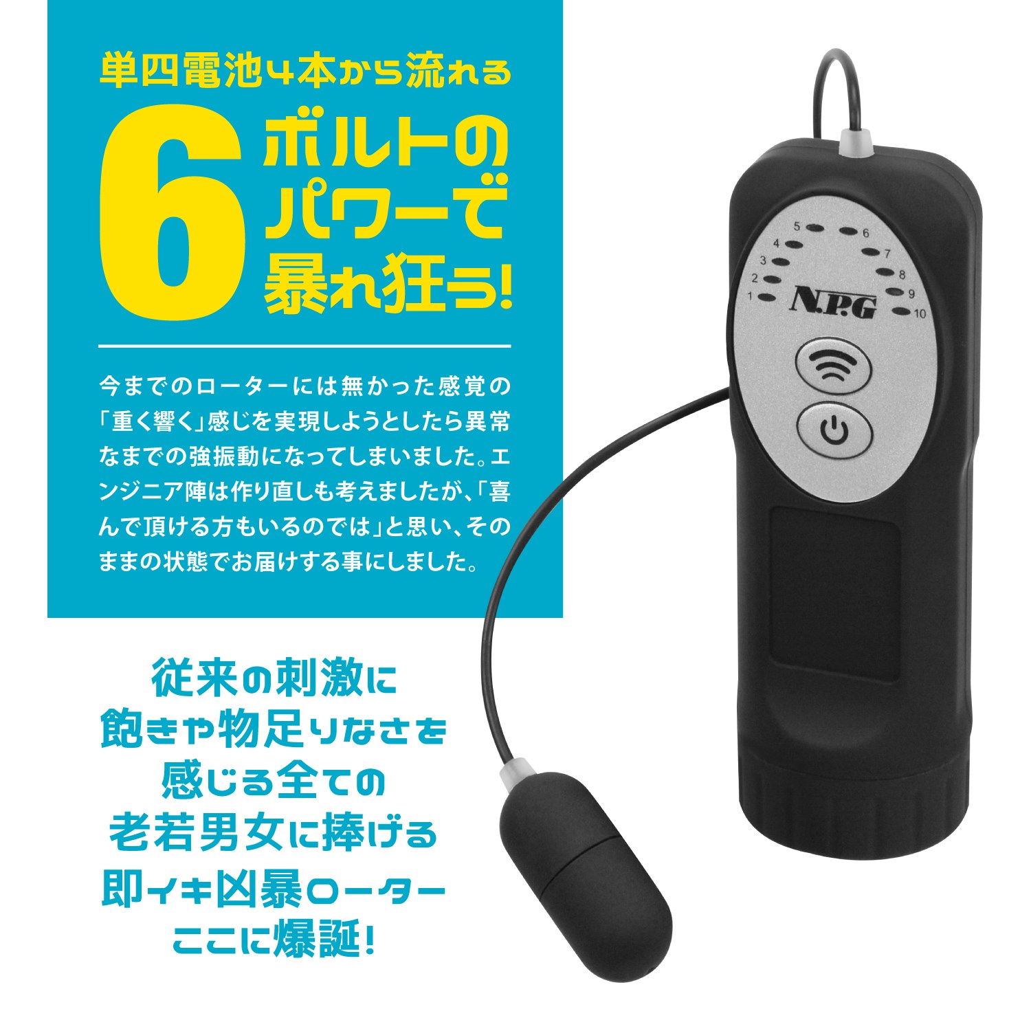 工場長もあせった強力な振動(汗)!今までのローターには無かった感覚の「重く響く」感じを実現しようとしたら異常なまでの強振動になってしまいました。エンジニア陣は作り直しも考えましたが、「喜んで頂ける方もいるのでは」と思い、そのままの状態でお届けする事にしました。 生活防水設計、10種類の振動パーン搭載、ひと目で振動パターンが分かるLEDライト、こだわりの作りで末永くご愛用頂けます!双頭のローター「取扱注意 6ボルト ダブルローター」も同時発売中! @