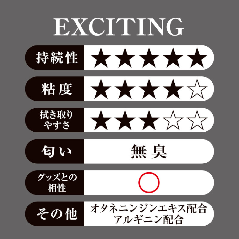 男性好みのしっかりと主張のある粘度と、長時間キープする潤滑力はマットプレイなどとの相性も抜群。