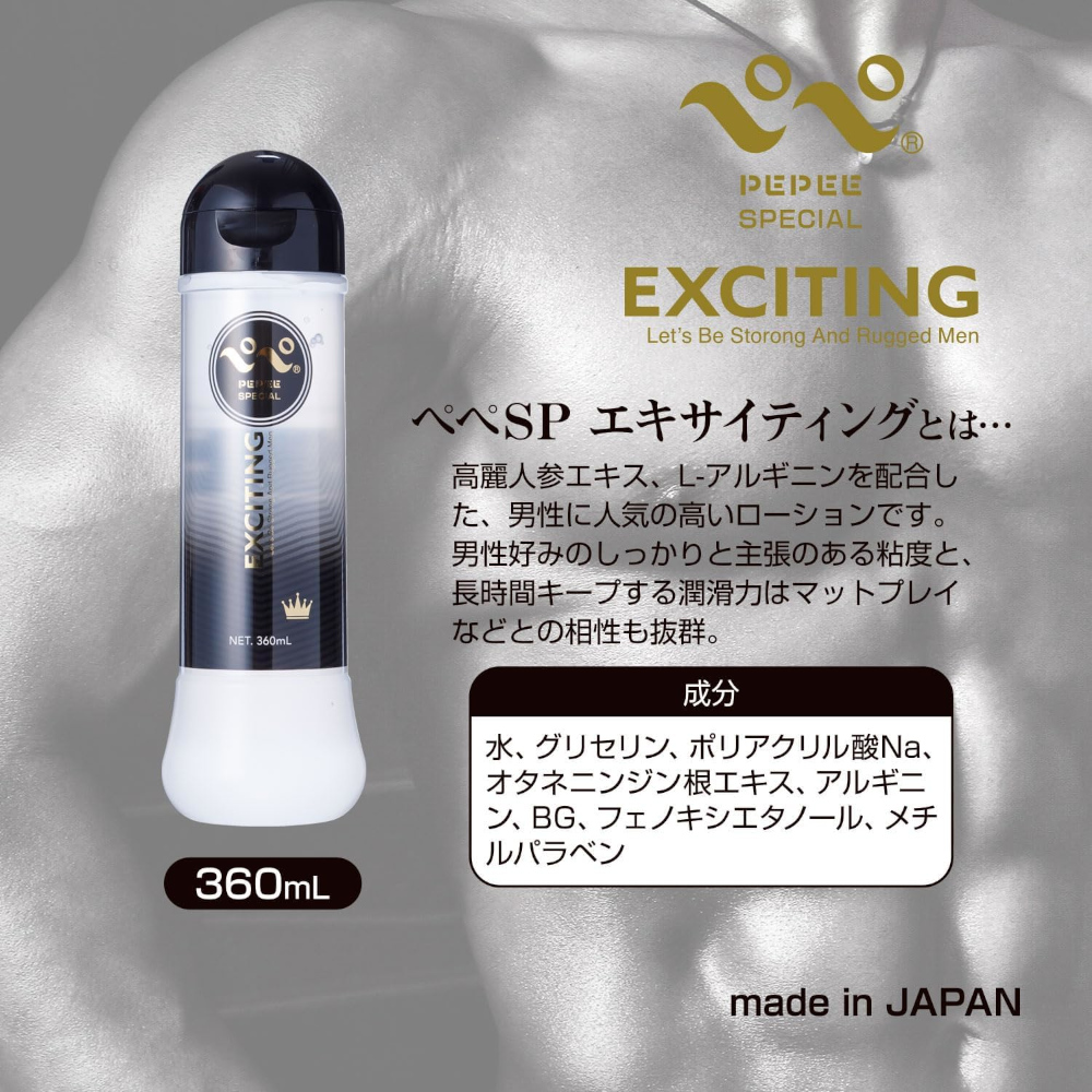 ぺぺスペシャル・エキサイティングは高麗人参エキス、L-アルギニンを配合した、男性に人気の高いローションです。 シンプルで使いやすい注ぎ口は、一秒を争う男性の欲求に応える隠れた人気ポイントになっています。 男性好みのしっかりと主張のある粘度と、長時間キープする潤滑力はマットプレイなどとの相性も抜群。 いつも以上に燃え上がる様なプレイが楽しめると好評をいただいています。 国内の工場で作られた、男性にぴったりの純国産ローションです。 パッケージサイズ(mm): H205×W62×D62 重量: 総重量420g 原産国: 日本 内容量: 360ml@