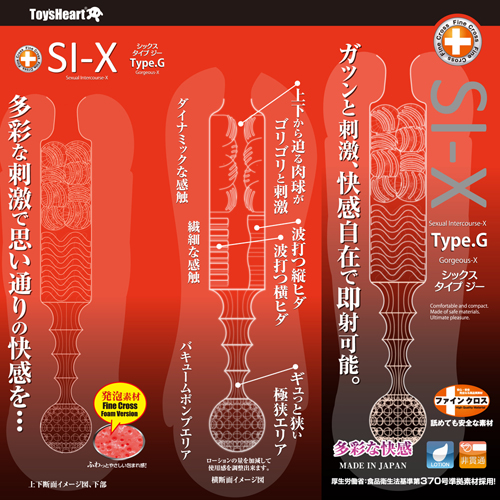 累計売り上げ100万個を超えるSI-Xシリーズに待望の新作登場!SI-X Type.G シックスタイプジーガツンと刺激、快感自在で即射可能。タイプGのコンセプトは、ずばり『ゴージャス・セックス』・入り口付近では大きな肉球が上下からサンドイッチ。強烈な圧迫感がゴリゴリと攻め立てます。・中央部では『縦ヒダ』『横ヒダ』による絶妙なコンビネーション愛撫。・ギュっと狭い極狭エリアをくぐり抜け、イボイボバキュームエリアでエクスタシー!めくるめく多彩な快感をご堪能ください
