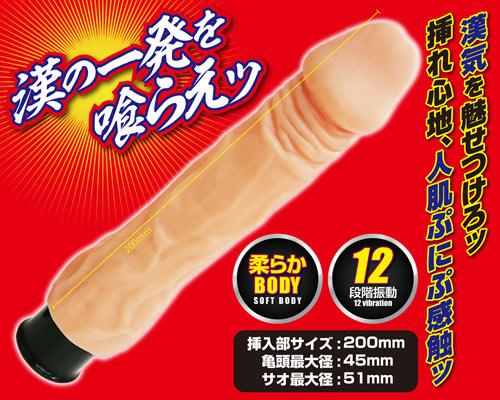 挿れ心地、人肌ぷにぷ感触! 漢の一発を喰らえッ! 肉厚でソフトな柔らかさなので挿入時は入れやすく、内部をいっぱいに満たします。芯棒を曲げて好きな角度に調節可能で、G責めだって出来ちゃうスグレモノ! 加えて12種類の振動パターンを搭載!電源ON/OFFや振動パターンの切り替えもワンボタンで出来るシンプルな操作性です。 挿入部全長:200mm 亀頭最大径:45mm 竿部最大径:51mm 単3電池×2本付属 .@