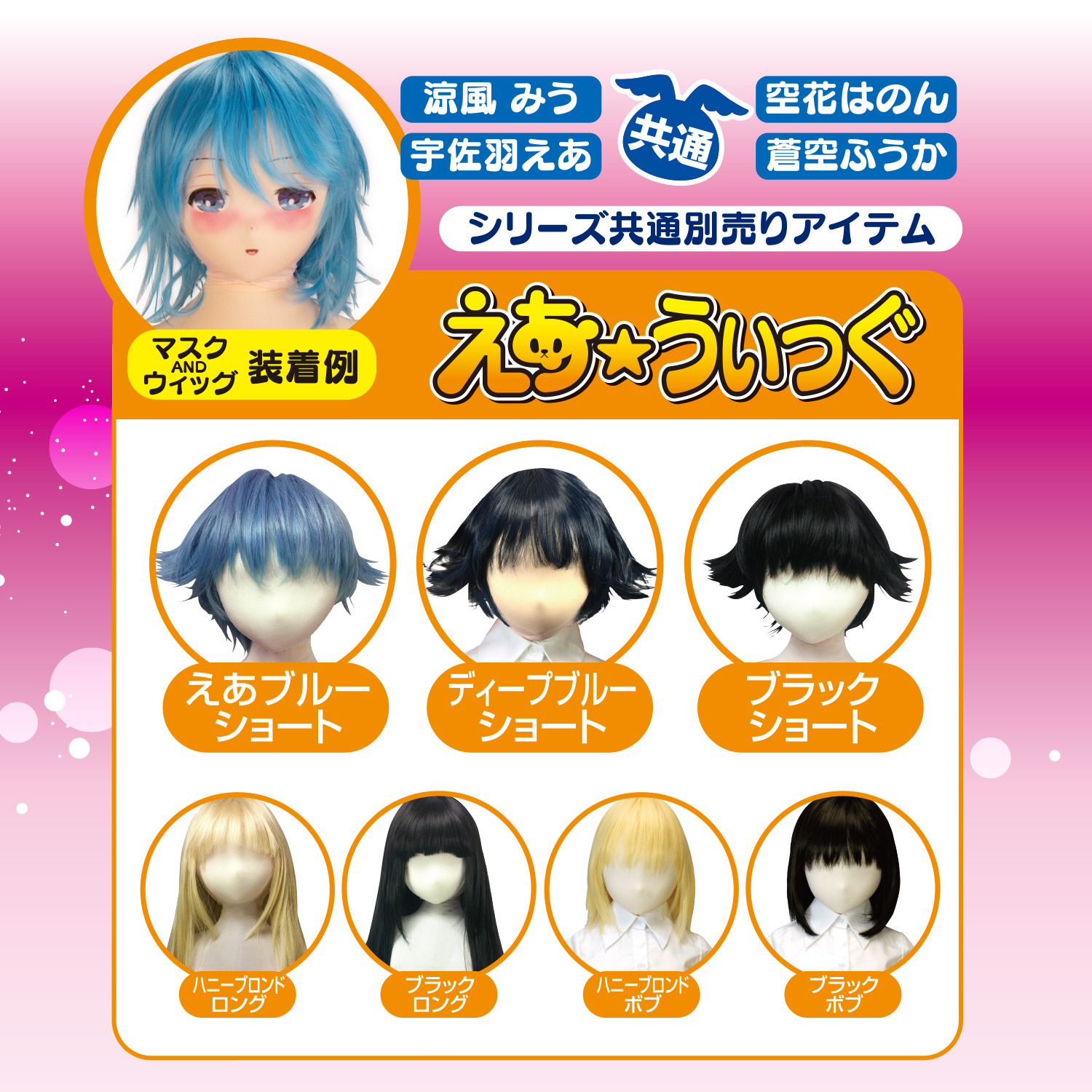 ※えあシリーズの【えあ★うぃっぐ】【えあ★ますく】【えあ★まん】【オナホ設置アダプター】が共通で装着出来ます。
