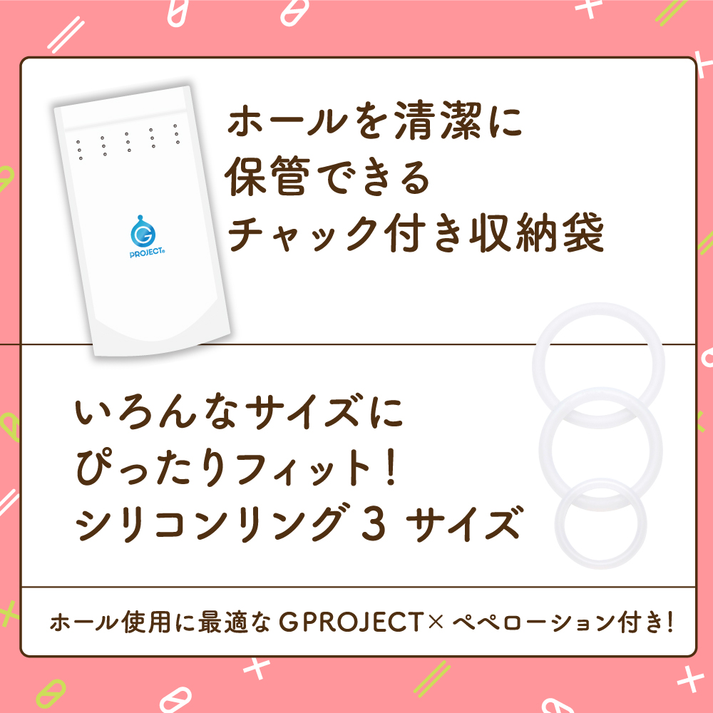 『早くイッちゃダメ!』刺激ほぼゼロ!超絶まったり系!とぅるんとぅるん快感でとろけるレッスン!付属のシリコンリングで敏感部分を露出し先端強化!ぷにっとソフトなリングで優しい締め付けを可能にしています。大中小の3種類でいろんなサイズにぴったりフィットします。直接肌に触れるものだから安心の国産素材&国内生産。 パッケージイラスト:うなさか / ■商品サイズ(mm) 縦168横120奥行60 ■商品重量(g) 270 ■本体サイズ(mm) 縦115横60奥行55 ■本体重量(g)、内容量(ml) 219 ■付属品 GPROJECTxPEPE 5ml ローション・G PROJECT 収納袋・シリコンリング3種 @