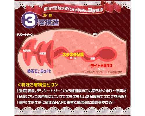 入口部は侵入しやすいSoft素材。部位で感触が変化する特殊な3層構造。純潔膜を通過した膣内は純潔の締まり、ぷにぷにとギチギチの両方をワレメ状の波打つ膣壁構造に刺激されながら感じられます。