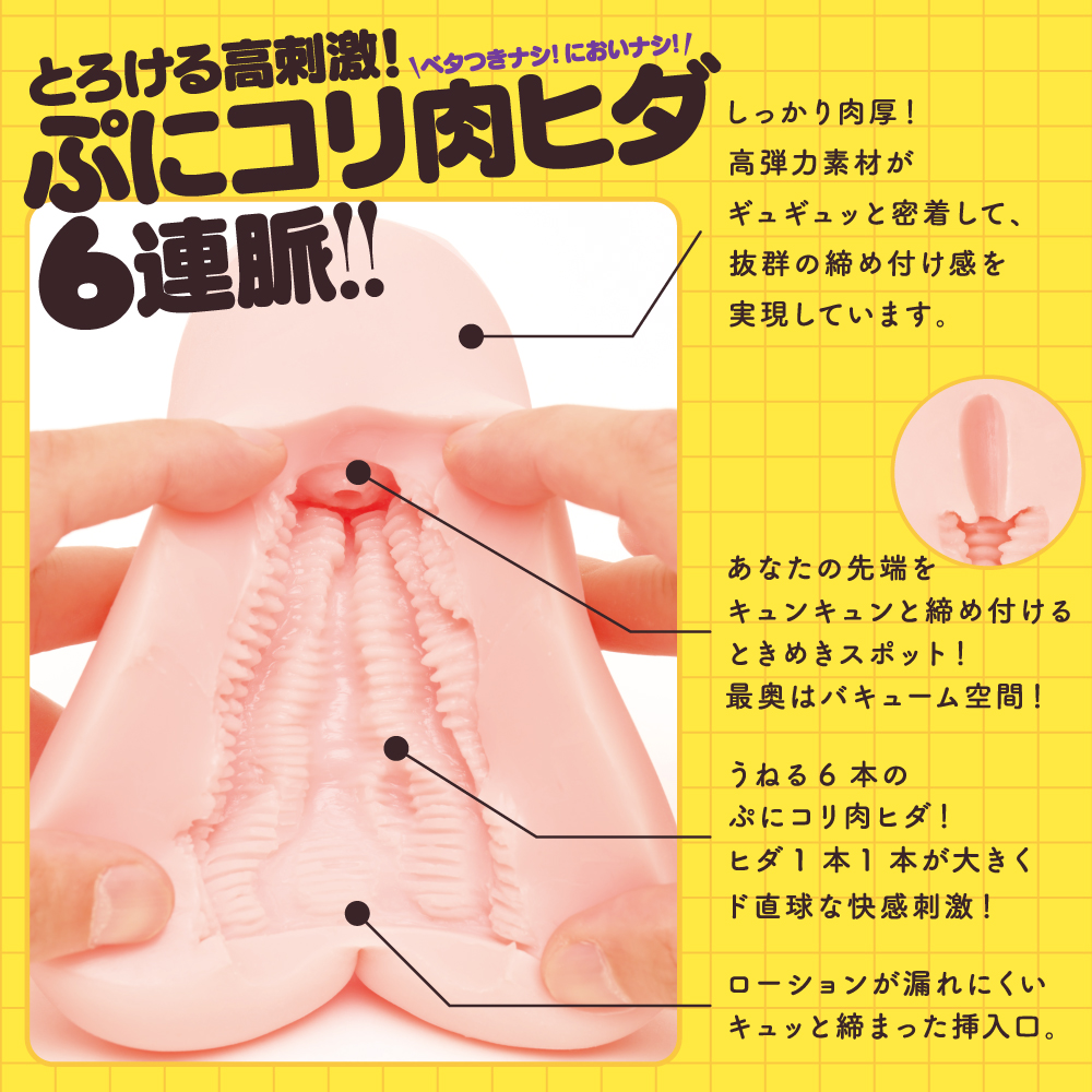 とろける高刺激!ぷにコリ肉ヒダ6連脈!しっかり肉厚重量約300g!うねる6本のぷにコリ肉ヒダ1本1本が大きくド直球な快感刺激!ピストンしたり回転させたりすることで刺激のバリエーション無限大!覚醒型素材【GROW UP SKIN】は使うほどにあなたに馴染んで成長する人肌感覚の高弾力素材です。直接肌に触れるものだから安心の国産素材&国内生産 MADE IN JAPAN。