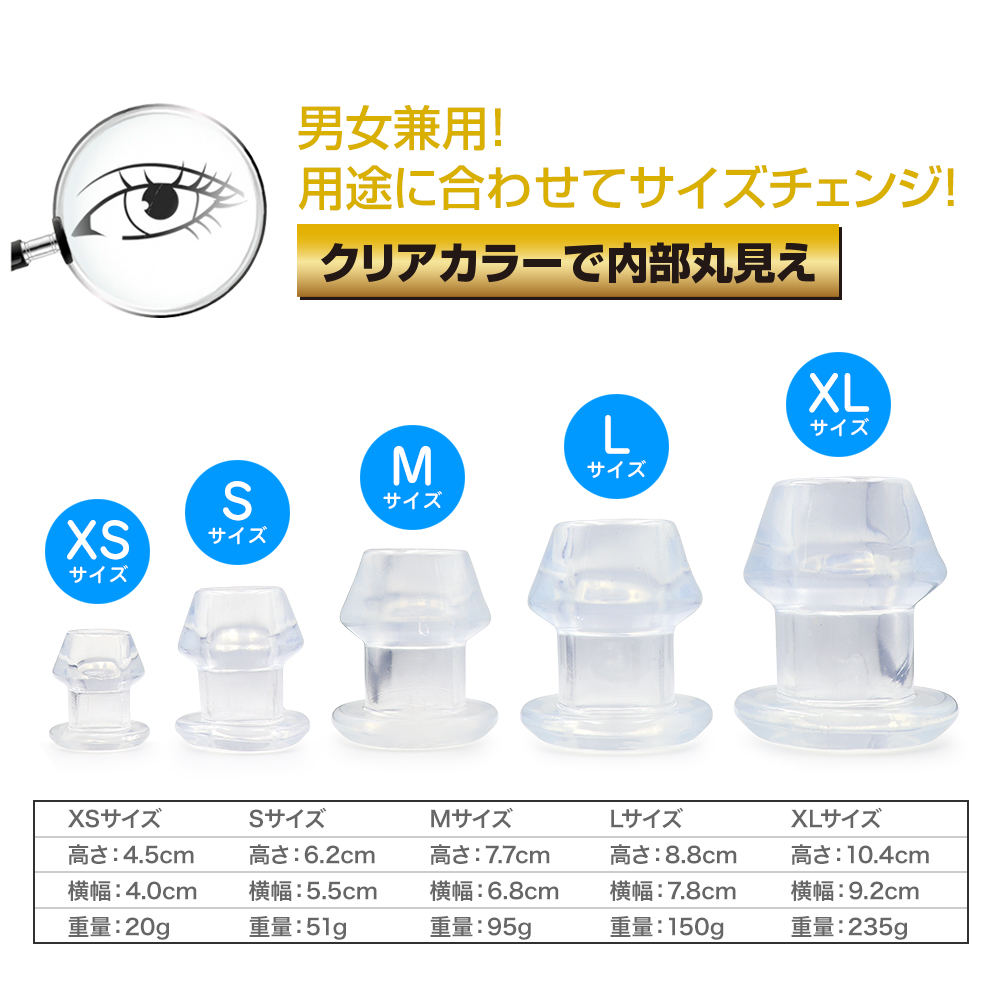 内部穴360度見渡せる極上の光景幅広いプレーが可能な多用途プラグ柔軟性と形状保持力を備えた透明色の拡張アイテムです。拡張プレイだけでなく観賞や洗浄、ローション注入等、幅広く活用できます。 5サイズ展開はレディース、メンズ、初心者、上級者と使い分けが可能。ご自身の判断でご利用ください。 素材:TPRサイズ:Sサイズ全長:62mm 最大幅:50mm(底部を除く) 空洞内径:24mm ■商品サイズ(mm) 縦170横110奥行57 ■商品重量(g) 55 ■本体サイズ(mm) 縦62横55奥行55 ■本体重量(g)、内容量(ml) 51 .@
