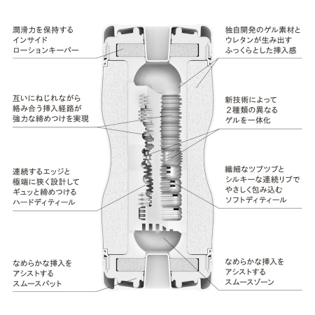 超ソフト&超ハード! 2種類のゲルを一体化。 新技術によって、極端に異なるゲル素材を一体成形することに成功!全く異なるふたつの快感をお楽しみいただけます。 SOFT GEL SIDE:まったり絡みつくソフトゲルと、繊細なディテールで優しく包みこみます。 HARD GEL SIDE:くっきり刺激するハードゲルと、肉厚ディテールでガッチリ締めつけます。 片側ずつじっくり使うも、交互に比べながら使うも、楽しみ方はあなた次第。 SOFT & HARDという、対極的なふたつの快感を楽しめる、贅沢仕様のカップです。@-