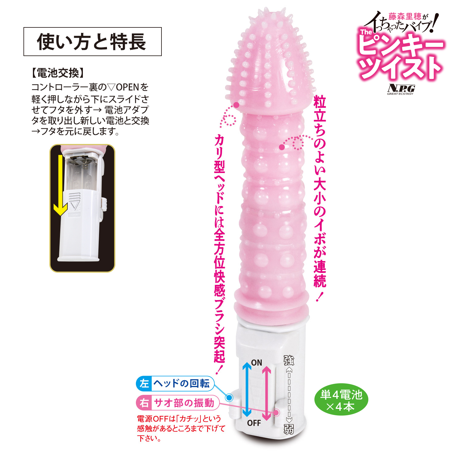 藤森里穂がイッちゃった! プロに愛されるシンプル系バイブの最高峰! こだわりの快感形状と繊細な操作感のストレートタイプ。 カリ型のヘッドには細かなブラシ突起、竿部には大小のイボ。 シンプル形状&ノーマルサイズでありながら突起の刺激が楽しめます。 パワーの微調整が可能なスライドコントローラーを採用。 ICプリセットにはない自由自在な操作が可能! 回転・バイブそれぞれが独立した2スライド。 使用長:147mm 単4電池×4本使用 .@