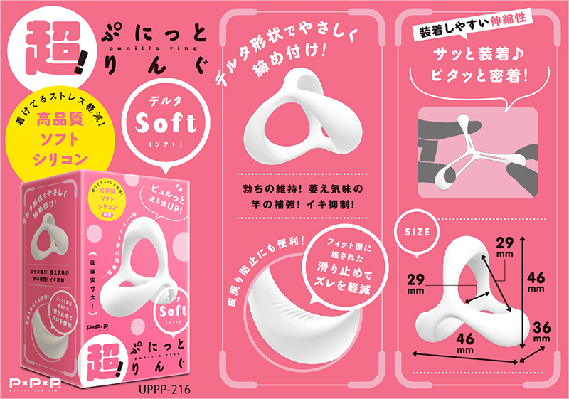 超!ぷにっとりんぐからサッと装着♪ピタッと密着!根元を3点締めしてくれるデルタ ソフトverが登場。臭いのない高品質ソフトシリコンで着けてるストレスを軽減!デルタ形状でやさしく締め付け!勃ちの維持!萎え気味の竿の補強!イキ抑制!フィット面に施された滑り止めがズレを軽減し、皮戻り防止にも便利です。ビュルっと出る感UPでゆ~っくり夢心地発射! @