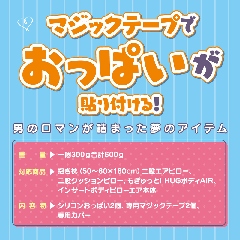 いつもの抱き枕におっぱいが!! 男のロマンが詰まった夢のアイテム 柔らかおっぱい揉み放題! 被膜付きシリコンおっぱい2個1ペア 被膜付きだから油染みナシ! マジックテープでおっぱいを貼り付けられる! 2次元が3次元のリアルおっぱいに! 重量:一個300g合計600g 対応商品:抱き枕(50~60×160cm)二股エアピロー、二股クッションピロー、もぎゅっと! HUGボディAIR、インサートボディピロー 内容物:シリコンおっぱい2個、専用マジックテープ2個、専用カバー @