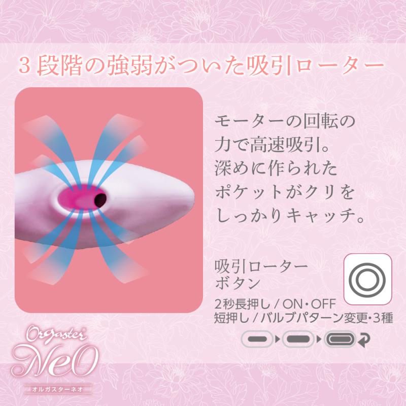 累計販売数200万個を突破した人気商品『オルガスター』より待望の新作が登場! 産婦人科の先生と研究を重ね共同開発した独自の特別なヘッド形状を さらに磨き上げ、吸引ローターを搭載した最高傑作モデルです。 独自開発されたヘッド内部には毎分13,500回転のハイパワーローターを内包。 マッサージボタンを押すごとに振動が変化し、お好みの刺激が味わえます。 するするスベスベとした最高級医療用シリコンで作られており、肌触りやしっとりとした 質感も高次元で実現しました。 膣内でピタッと吸い付くような特殊形状のヘッドが振動することで、敏感な部分を しっかり刺激し心地よいオーガズムが得られます。 膣圧向上にも効果があり、男性を喜ばせる名器へと女性力をアップさせます。 実際にアンケート結果では膣圧向上が目的でオルガスターを使用される女性 か想定より数多くいらっしゃいました。 『効果が実感できる』という意見も数多くいただいております。 そして高次元の吸引ローター搭載。 内部のモーターを高速で回転させることにより得られる特別な吸引力。 吸引ポケットを深く設計し、クリ全体を余すことなくキャッチします。 通常の振動とは違う吸引される刺激は更なるオーガズムの高みへと導いてくれます。 お好みの吸引力を3パターンから選べます。 ネック部分は柔らかく曲がりやすいので、優しく位置調整ができ 全ての女性のカタチにフィットさせることができます。 内部ローターと吸引機能は別々に操作できますので、様々な刺激を体感できます。 USB充電方式を採用し、より長くよりパワフルになりました。 全世界の女性を虜にしてきたオルガスターの最高峰『オルガスターネオ』 是非ご堪能ください。 本体は生活防水仕様となっております。 使用後は優しく水洗いし水分を拭き取って保管してください セット内容:オルガスターネオ本体、USB充電コード、保存用ポーチ 本体サイズ:W35×H135×D86(mm) 充電時間:90分 連続使用:30分 生活防水仕様 本体重量:120g パッケージサイズW112×H186×D52(mm) 外装重量:320g@