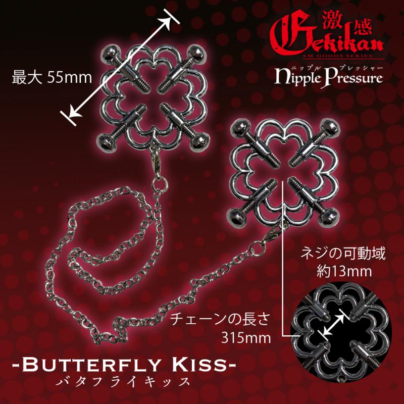 SMをもっと過激に、そして美しく淫靡に彩る。 凌辱感を与え、その姿を見て興奮し燃え上がる。 激感シリーズから乳首を彩りながら責め立てる『激感ニップルプレッシャー』が新発売! ソフトプレイからハードプレイまで刺激を調整できます。 本格的に締め上げて痛みを与えるSMグッズとしてはもちろんのこと、 そっと装着して乳首を彩るアイテムとしても使用できます。 シリーズ全5種類 様々なデザインそして刺激をお楽しみいただけます。 【バタフライキッス】 装着した姿はまるで蝶が乳首に舞い降りたような印象のモチーフ。 4方向からのネジを締め上げることで装着します。 キツく締め上げることもできるハードタイプのニップルピンチです。 左右の器具にチェーンが付いており装飾性をより高めています。 チェーンはワンタッチで脱着可能です。 4つのネジを1本ずつ徐々に締め上げる歓び。 締め上げるネジの角度によって変わる刺激を味わえます。 見た目も美しく派手で、目でも楽しめる一品です。 本体サイズ:W55×H55×D8(mm) チェーン長さ:330mm 本体重量:20g(1個)×2入 パッケージサイズ:W60×H70×D26(mm) 外装重量:52g @