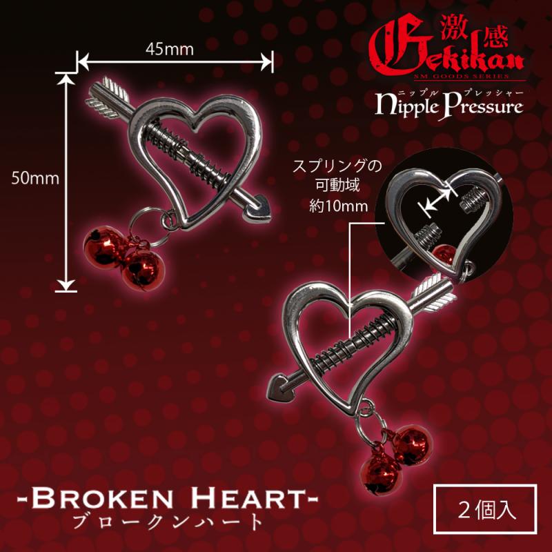 SMをもっと過激に、そして美しく淫靡に彩る。 凌辱感を与え、その姿を見て興奮し燃え上がる。 激感シリーズから乳首を彩りながら責め立てる『激感ニップルプレッシャー』が新発売! ソフトプレイからハードプレイまで刺激を調整できます。 本格的に締め上げて痛みを与えるSMグッズとしてはもちろんのこと、 そっと装着して乳首を彩るアイテムとしても使用できます。 シリーズ全5種類 様々なデザインそして刺激をお楽しみいただけます。 【ブロークンハート】 ハートを矢で貫いたデザインが特徴。 矢の先端と後ろを両手で引っ張り装着します。 挟める最大幅は約10mm。内部に設置されたバネの力によって圧力をかけます。 まるで乳首にピアスを開けたような見た目になるハート型のニップルピンチです。 動くたびに奏でる鈴の音が淫らな気分を盛り上げます。 本体サイズ:W45×H50×D5(mm) 本体重量:18g(1個)×2入 パッケージサイズ:W60×H70×D26(mm) 外装重量:42g @