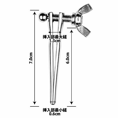 押し広げたい!そんなご要望にお答えした至高のフェチアイテムの登場です。最大経は1.3cmで、カナネジがしっかりと開口幅をキープしてくれるので、調整のしやすさもバッチリ。長すぎず、太すぎずのちょうどいいサイズは、未知なる快感を体験してみたい!にピッタリ。2サイズ展開なので、自身のレベルに合わせてお選びいただけます。ステンレス製なので煮沸消毒で清潔にご利用出来ます。 パッケージサイズ:H165mm×W90mm 本体サイズ:全長7cm 挿入部6cm 最大経1.3cm @