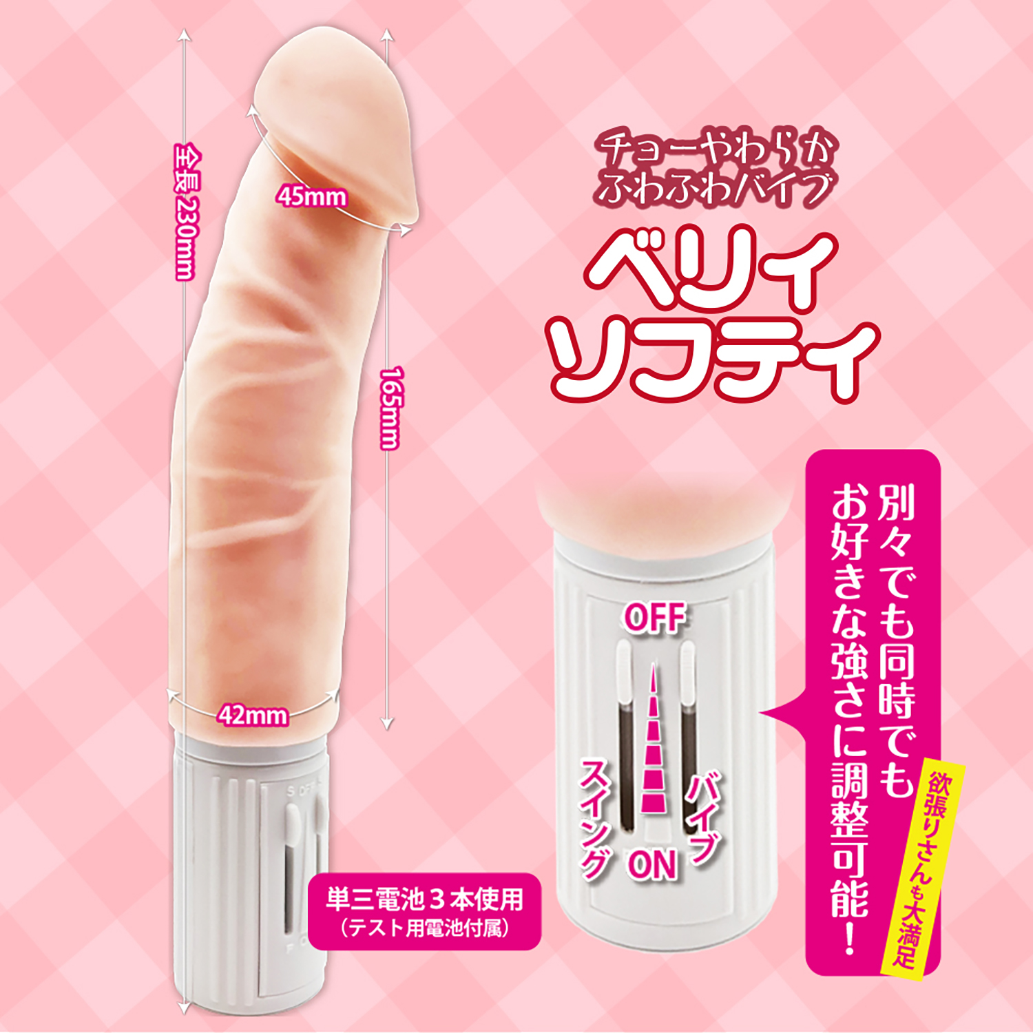 大きくたくましいボディとチョーやわらかふわふわなバイブ「ベリィソフティ」 大迫力のカリ高ヘッドと、極太の竿が力強いスイングで奥の奥まで掻き回す! 最大の特徴は、とっても伸びる優しい弾力のマシュマロスキン。ふわふわもちもちな感触は、敏感な部分を刺激することでも楽しめます。 スイングとバイブがそれぞれ無段階調整可能。お好みの強さに合わせてお使いいただけます。竿は少しの力で曲げることができるため、角度を調整して快感ポイントを狙い打ちに♡ 大きさ・性能ともに満足感抜群のバイブです。 単三電池3本使用 バーコード: 4571536720954 外装サイズ: 235 ×65 ×50 mm 外装重量: 300g 商品サイズ: 230×45mm 商品重量: 220g 付属品: 単三電池3本 .@
