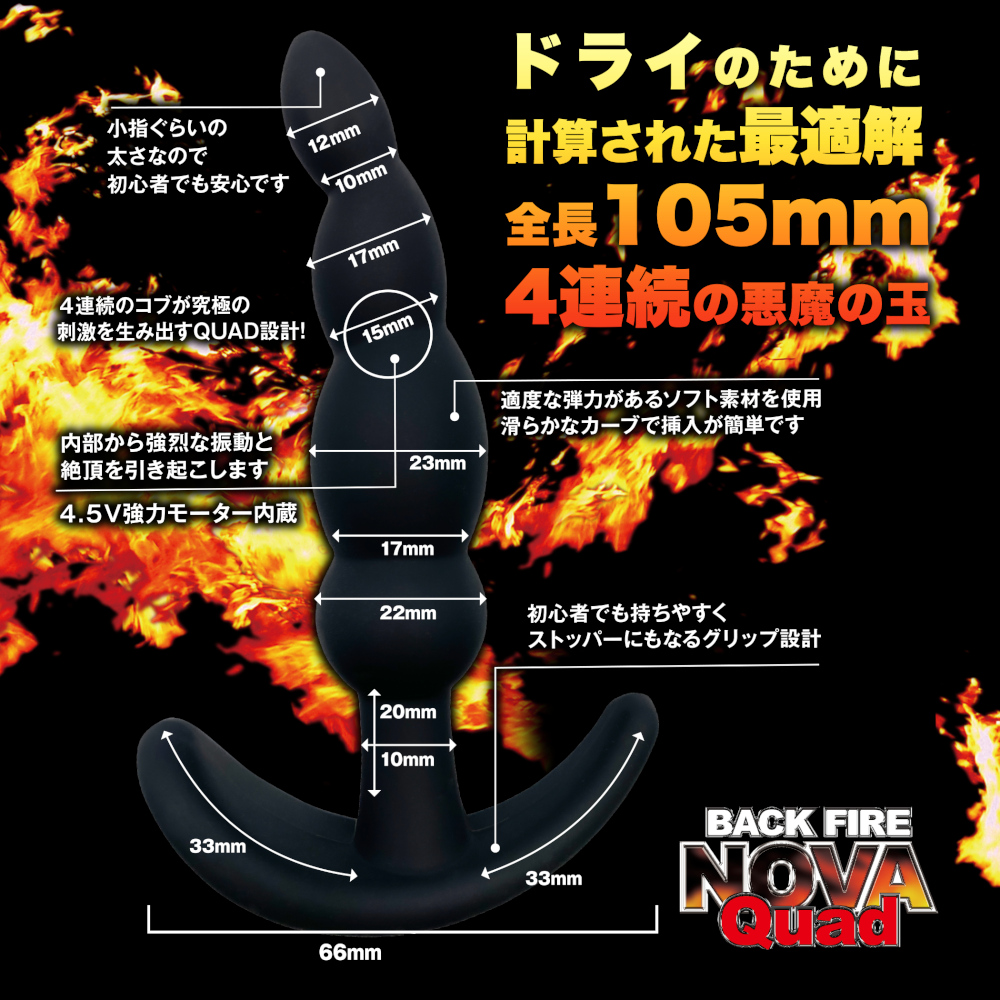 大人気のバックファイアーシリーズに、初心者向から中級者向けラインの「NOVA」シリーズが新登場! アナルに挑戦をしてみたいけど・・・と悩んだら、NOVAシリーズがおすすめ! クワッドは、座薬サイズほどの10mmの先端から始まり、指のように緩やかなカーブで16mm、22mm、21mmと、全部で4連続(クワッド)の隆起が続く設計になっています。 内部に密着し、緩やかなカーブが前立線やGスポットなどをダイレクトに刺激します。 奥まで入れると、入り口付近で強烈な振動と快感を引き起こすスタイルになっています。 10段階の振動の切り替えと4.5V強力な振動パワーを備えた、100%シリコンのプラグです。 グリップにもストッパーにもなる台座部分は、安心の65mm幅で確実にSTOPします。 .@