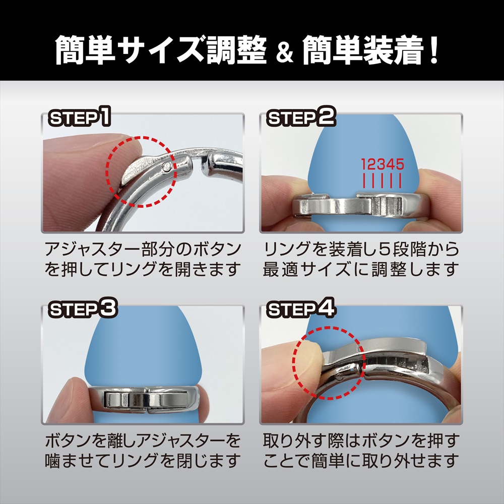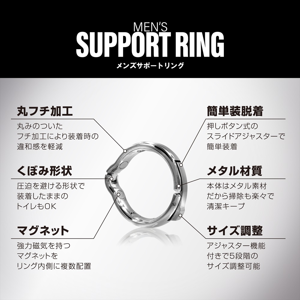 男のプライドをサポートする5段階調整可能なリングです。通常時「24mm~26mmサイズ」が新登場!! 装着したままでトイレも行えるくぼみ形状、スライドアジャスターで簡単装着、メタル素材なので丸洗いできて清潔キープ。 @