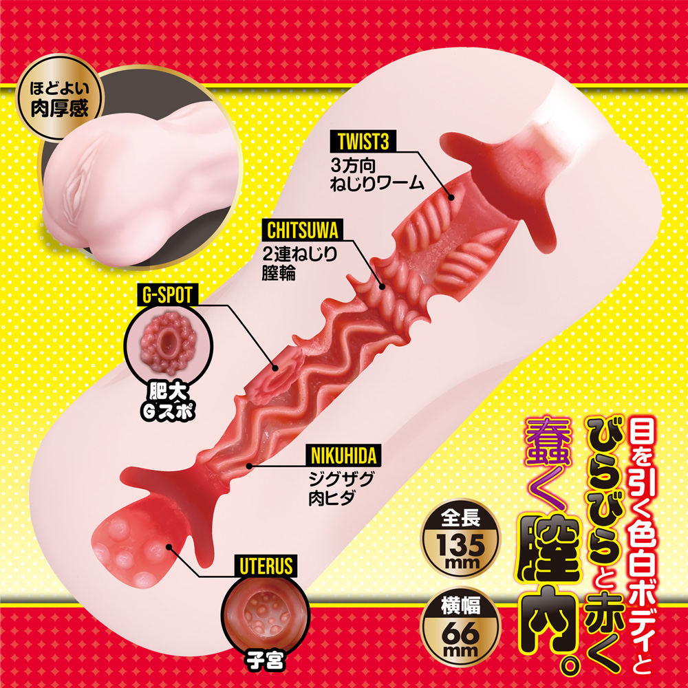 未熟な見た目と、早熟した膣内と。 目を引く色白ボディとびらびらと赤く蠢く膣内。 ねじれた2連の膣輪とジグザグとした肉ヒダがメリメリと亀頭・カリ・竿全体にねっとりと纏わりついてくる…。 未熟な見た目とは裏腹に、肉ヒダの波にすっぽりと飲み込み、アナタを弄ぶ。 【内部形状】 ■3方向ねじりワーム ■2連ねじり膣輪 ■ジグザグ肉ヒダ ■肥大Gスポ ■子宮 ・非貫通 ・ローション付属 @/