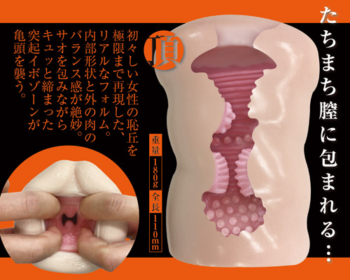 たちまち膣に包まれる。初々しい女性の恥丘を極限まで再現した、リアルなフォルム。内部形状と外の肉のバランス感が絶妙。サオを包みながらキュッと締まった突起イボゾーンが亀頭を襲う。