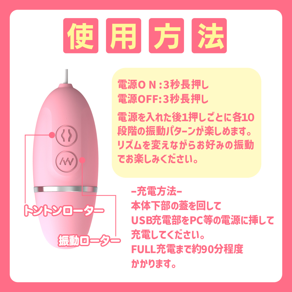 タップで刺激する新時代のローターが登場。 シリコン素材の柔らかなヘッドに「震える」だけでなく「タップする」機能も備えています。 コントローラー部分にUSBプラグが搭載されているので充電コードも必要ありません。 生活防水なので丸洗いも可能となっていますので清潔に保っていただけます。 10種類の振動パターンと静音タイプ。 コントローラー部:最大径28mm/全長70mm ローター部:最大径26mm/全長72mm パッケージサイズ(mm):H160×W100×D38 重量:本体71g/総重量105g 原産国:中国 材質:ABS、シリコン@