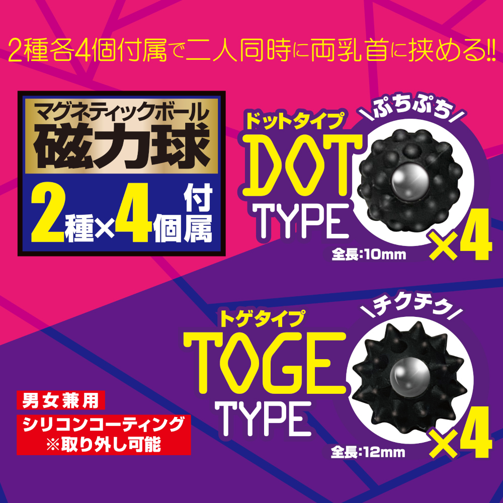 乳首やクリを磁石の力で挟む!!超強力な磁力を利用したクリッププレイが楽しめる。 2種類の形が異なるボールがそれぞれ4つずつ同梱されているので、様々な刺激を堪能可能。 強力な磁力で、突起をクリップ刺激しよう!! ■磁力球2種×各4個付属 ■シリコン部分、取り外し可能 パッケージサイズ(mm):H180×W90×D18 本体サイズ(mm):ドットタイプ:全長10mm/トゲタイプ:全長12mm 原産国:中国 材質:磁石、シリコン @