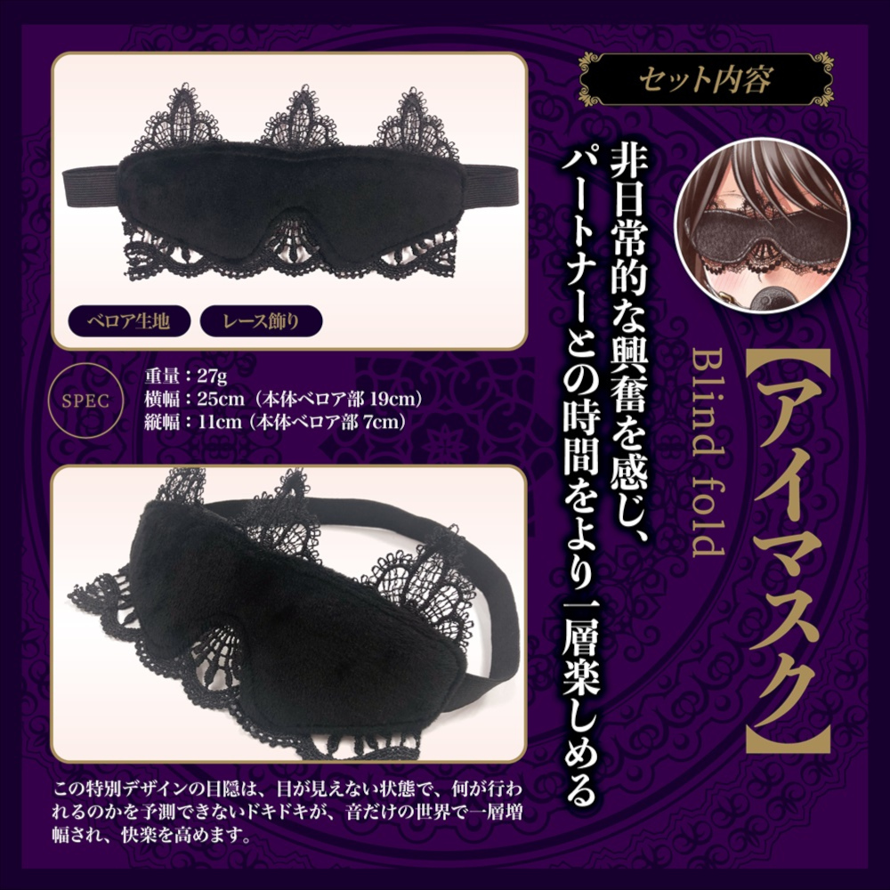アイマスク、口枷、手枷の3点セット。 非日常を体験するのにチープな物では気持ちも盛り上がりません。 高級感あるベロア生地とレースで飾りつけた心の奥のM願望を刺激してください。 本体サイズ アイマスク:250×110×10mm 口枷:640×46×46mm 手枷:295×115×10mm、チェーン長19.5cm パッケージサイズ(mm):H210×W155×D75 重量:本体237g/総重量306g 原産国:中国 @