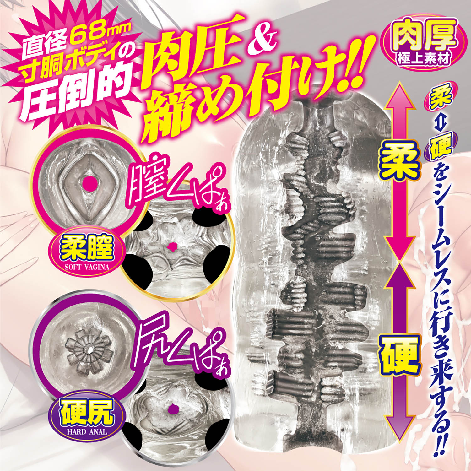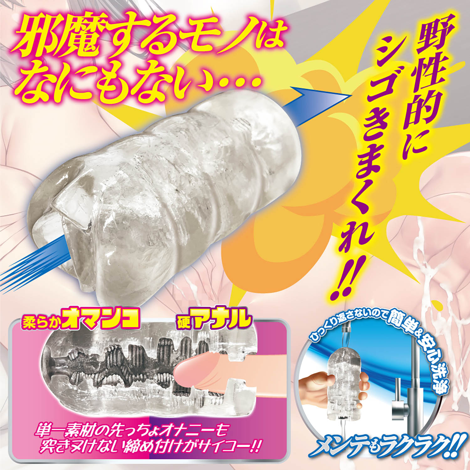 肉厚透明素材がググっと締め付ける!ソフト素材とハード素材のシームレス貫通ホール。 中まですけすけのクリア素材を採用した丸見え貫通ホール。膣側の入口はソフト素材、お尻側の入口はハード素材を使用し、シームレスな硬さの変化を楽しめます。内部構造はヒダや突起を複雑に配置。四方八方から締め付けとゾリゾリ刺激を生み出します。寸胴ボディなので肉厚感を存分に楽しめるとともに、貫通型ならではの開放感と先端刺激も味わえる贅沢仕様のホールです。