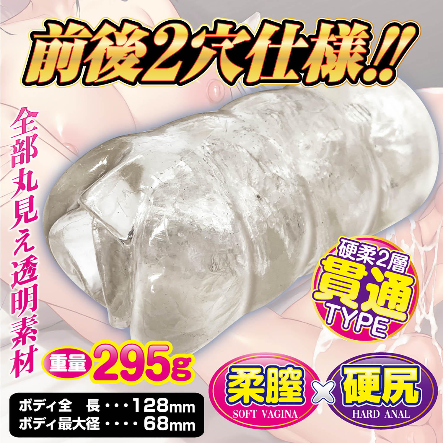 肉厚透明素材がググっと締め付ける!ソフト素材とハード素材のシームレス貫通ホール。 中まですけすけのクリア素材を採用した丸見え貫通ホール。膣側の入口はソフト素材、お尻側の入口はハード素材を使用し、シームレスな硬さの変化を楽しめます。内部構造はヒダや突起を複雑に配置。四方八方から締め付けとゾリゾリ刺激を生み出します。寸胴ボディなので肉厚感を存分に楽しめるとともに、貫通型ならではの開放感と先端刺激も味わえる贅沢仕様のホールです。 @/