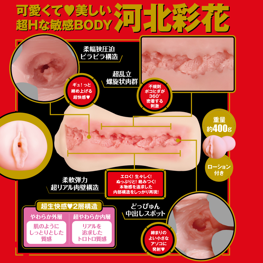 NO.1AV女優オナホ!!超生快感!2層構造『JAPANESE REAL HOLE 生』可愛くて!美しい!超Hな敏感BODY!河北彩花の極上名器をナマで奥まで存分に堪能!!枯れ果てるまで河北彩花に搾り取られます!!人肌感じる「エロ過ぎ造形・リアル挿入感」納得出来る「肉厚重量」【柔幅狭圧迫ビラビラ構造・超乱立螺旋状肉群・柔軟弾力超リアル肉壁構造・どっぴゅん中出しスポット】永遠にひとり占め出来るアナタだけの河北彩花とリアルで濃密な極上プレイをお楽しみください。
